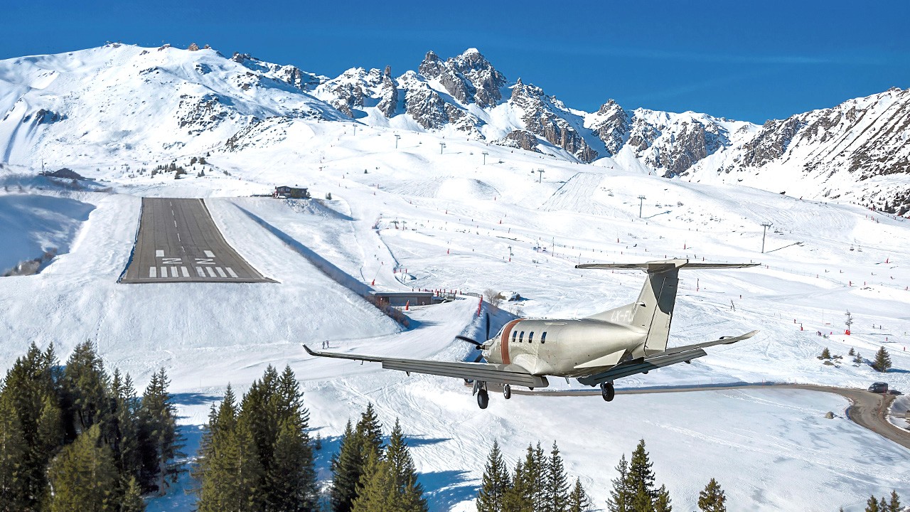 Courchevel Altiport, perched in the French Alps, is renowned for its challenging yet iconic runway. The airport sits at an elevation of 6,588 feet (2,008 meters), with a relatively short runway length of 525 meters, making it one of the shortest in Europe. The PC-12’s impressive performance in high-altitude and short-field conditions ensures it can take off and land efficiently, even in this mountainous and difficult terrain. This makes Courchevel an ideal destination for those seeking access to the ski resorts and alpine charm of the region.